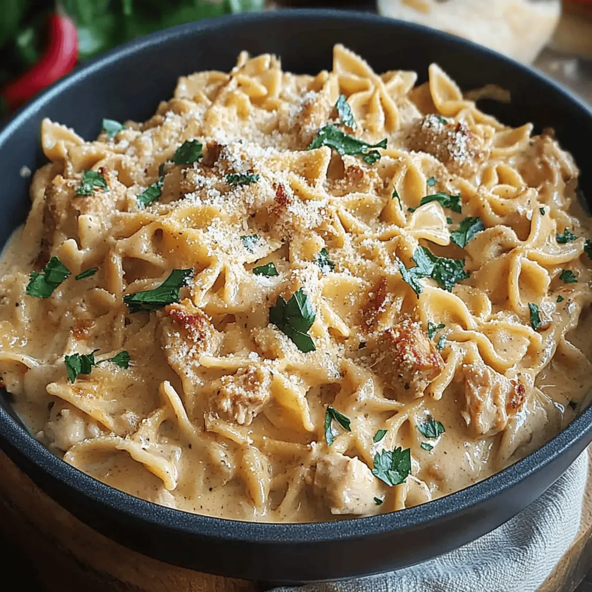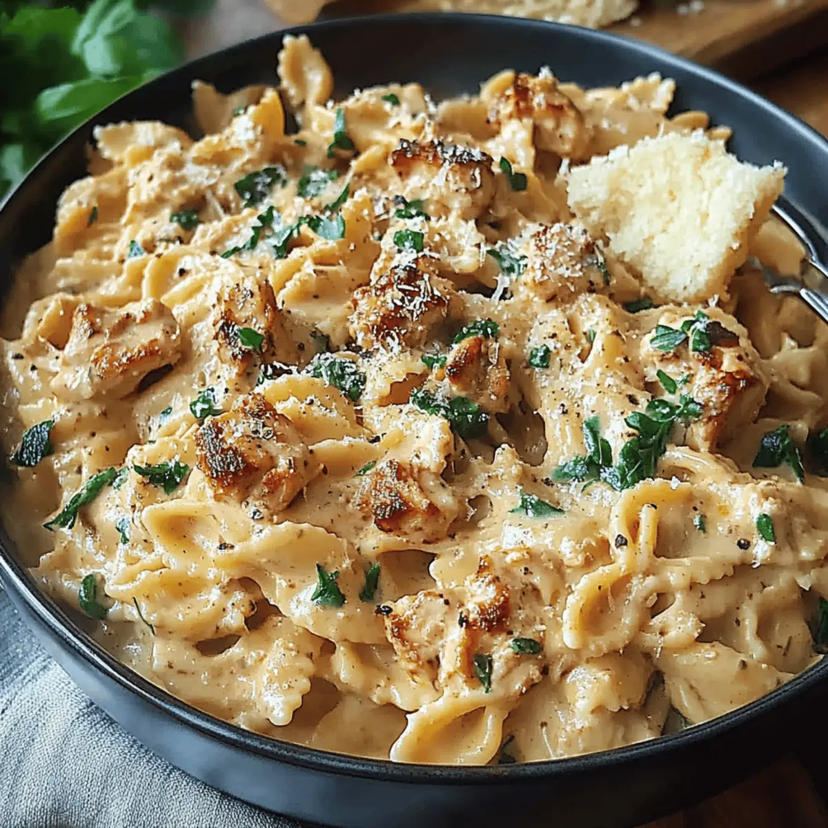 Just before serving, mix in a handful of freshly chopped basil for a burst of freshness. Serve hot, garnished with additional Parmesan cheese and a sprinkle of red pepper flakes if desired. Get ready for a delightful dining experience that’s sure to impress your loved ones with this creamy chicken pasta dish!