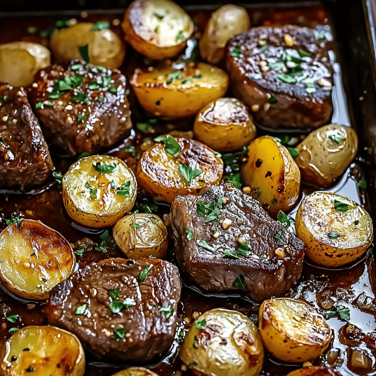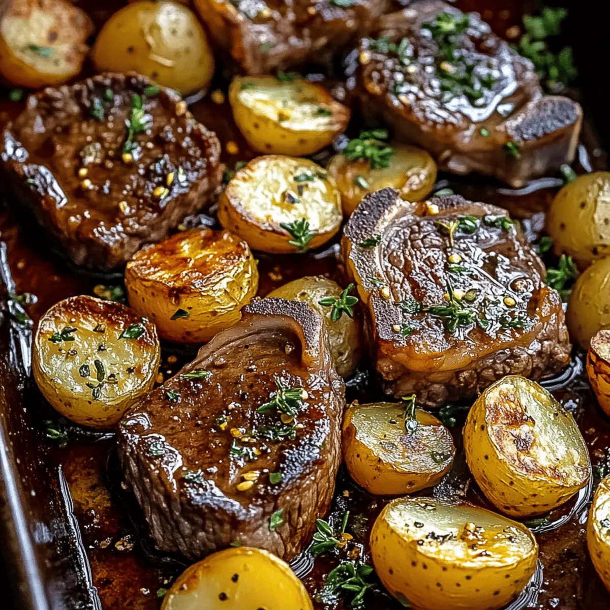 Return the pan to the oven for an additional 15 to 25 minutes, depending on your desired level of doneness for the beef. Keep an eye on the potatoes—they should be golden brown and fork-tender when done. A meat thermometer can help ensure your beef reaches about 130-135°F for medium-rare perfection.