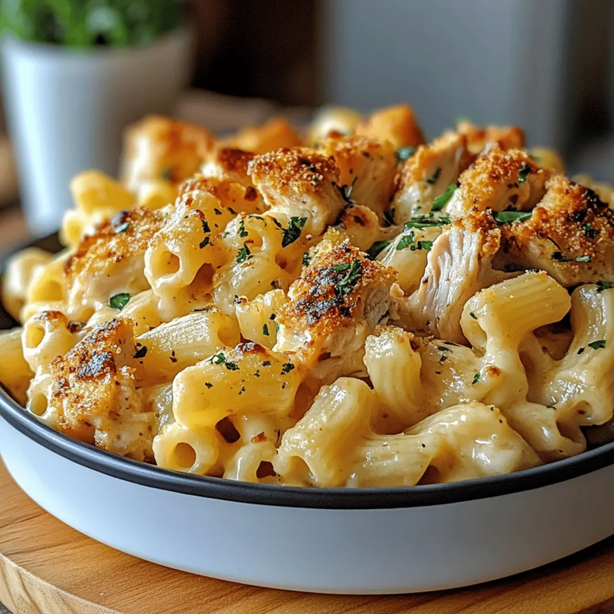 Once out of the oven, let the Cheesy Chicken Pasta Bake rest for about 10 minutes before serving. This allows the dish to set a bit, making it easier to portion. For an added touch, garnish with chopped fresh parsley to give brightness and a pop of color to this comforting meal.