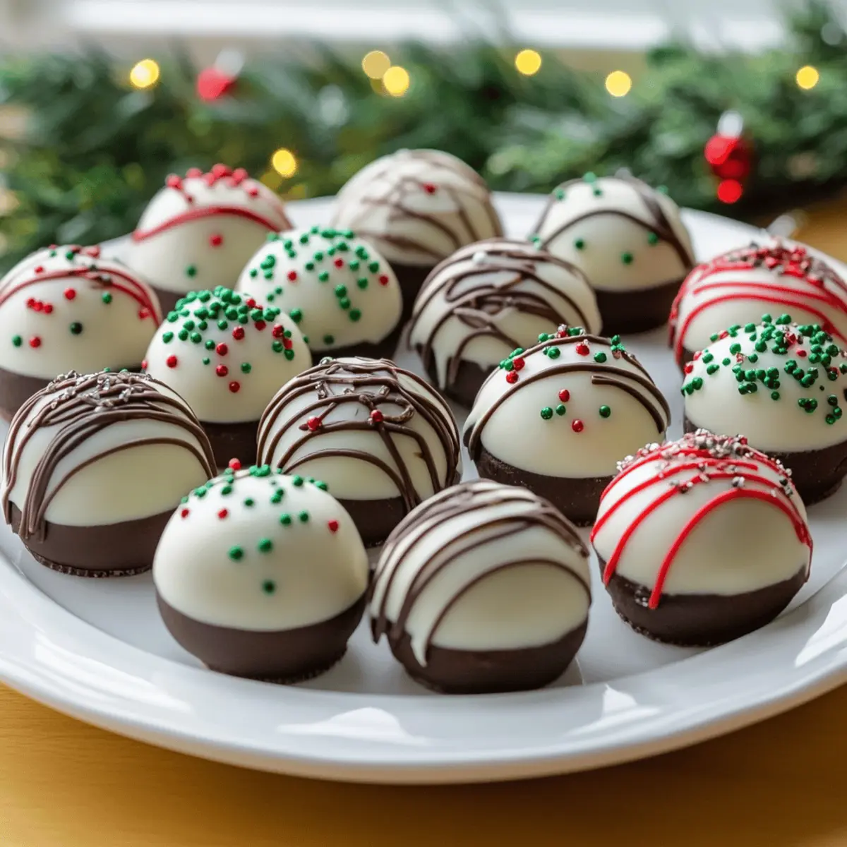 - Drizzle melted semisweet chocolate over each truffle and sprinkle with holiday sprinkles.