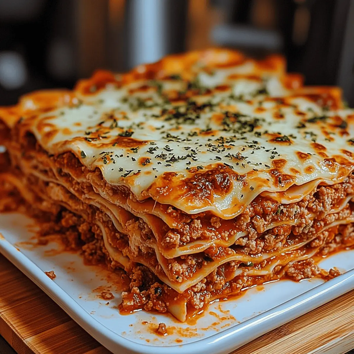 Using a sharp knife, cut the lasagna into squares and serve warm alongside a fresh green salad and garlic bread. Each slice showcases the beautiful layers of the rich sauce, creamy cheeses, and tender noodles, making for a perfect dinner that will impress family and friends.