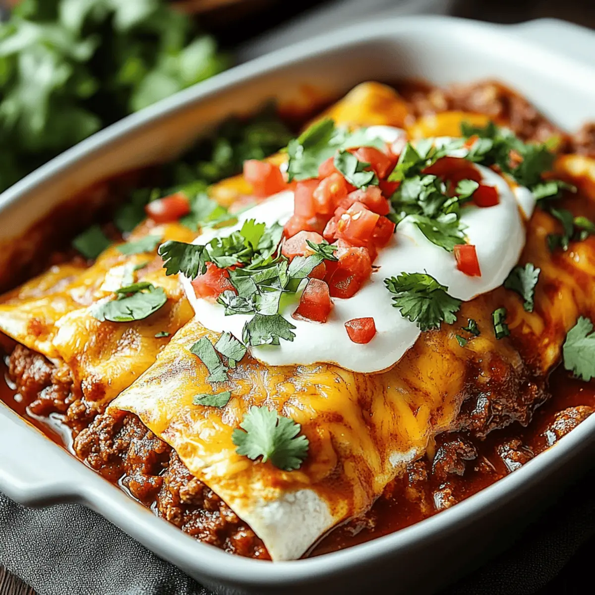 Once baked, remove the pan from the oven and let the Ground Beef Enchiladas rest for 5-10 minutes. This allows the flavors to meld and makes serving easier. Garnish with your choice of optional toppings like sour cream, guacamole, or chopped cilantro for an added burst of flavor.