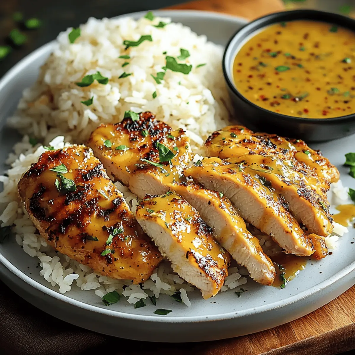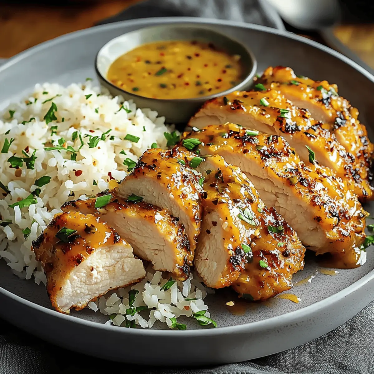 - Serve chicken over fluffy rice, drizzled with sauce, and garnished with fresh herbs.