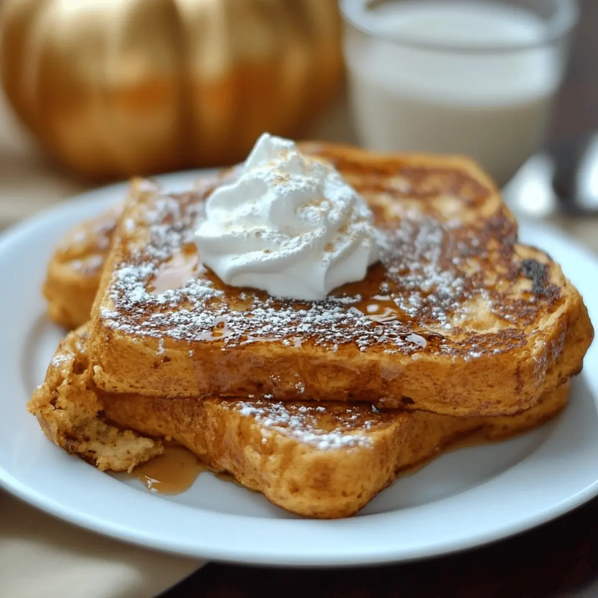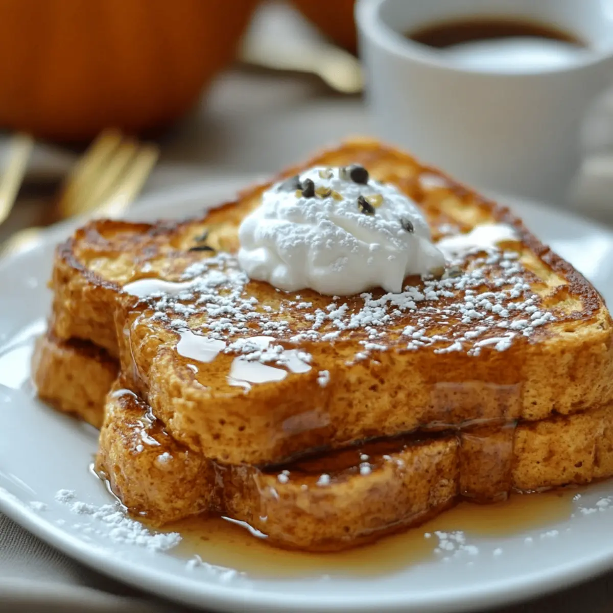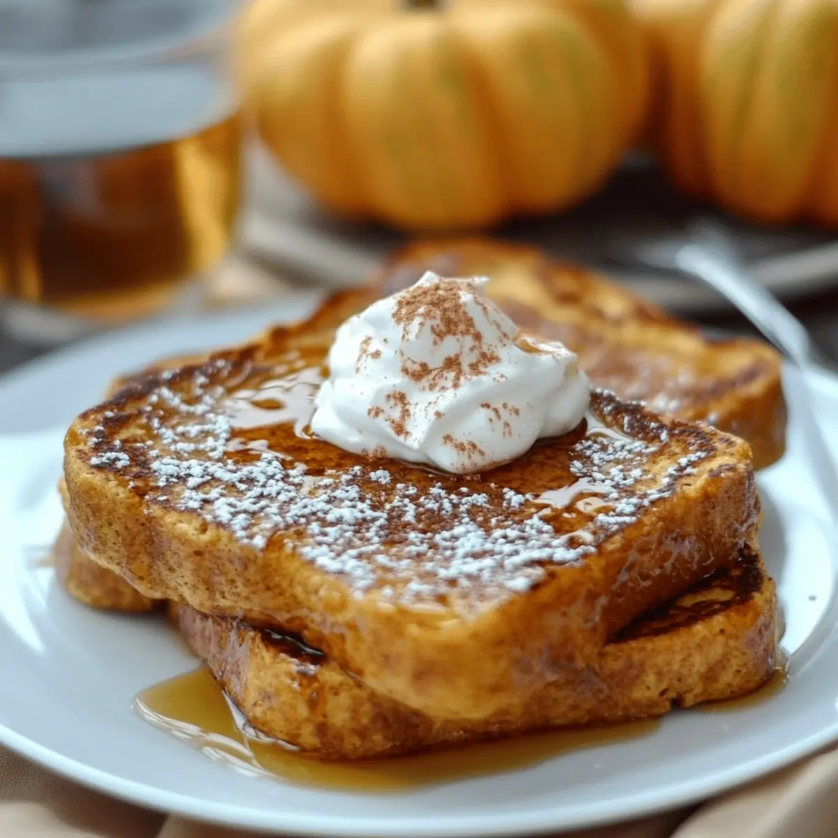 The moment the leaves start to turn, the scent of warm spices fills my kitchen as I whisk together a simple pumpkin batter. There’s something magical about making Pumpkin French Toast that transforms an ordinary breakfast into a cozy autumn experience. This recipe boasts a soft, custardy center that’s enriched with creamy pumpkin puree and a delightful combination of cinnamon and nutmeg. It’s the kind of dish that’s not only a breeze to whip up, making it perfect for busy mornings, but also one that will have everyone at the table smiling with joy. Whether you're planning a weekend brunch or a quiet weekday pick-me-up, this Pumpkin French Toast is ready to be your new go-to! What unique toppings will you choose to make it your own?