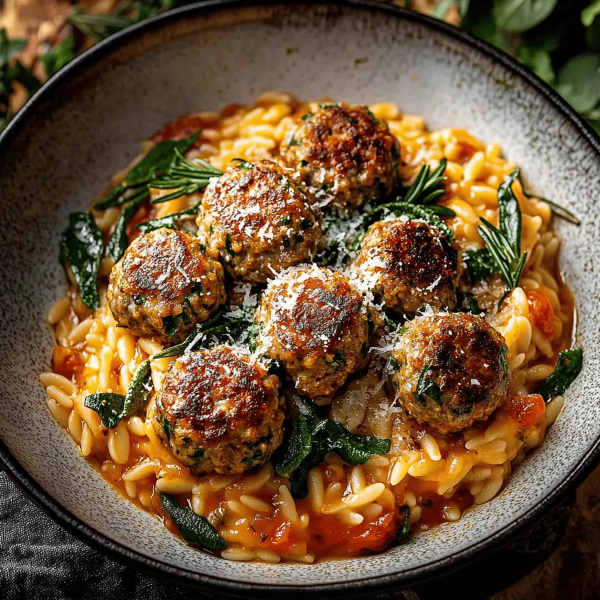 Juicy Rosemary Chicken Meatballs with Tomato Orzo Bliss