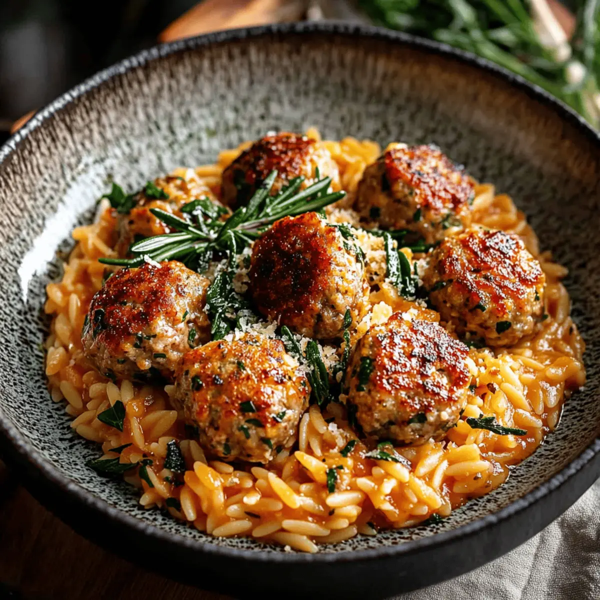 Juicy Rosemary Chicken Meatballs with Tomato Orzo Delight